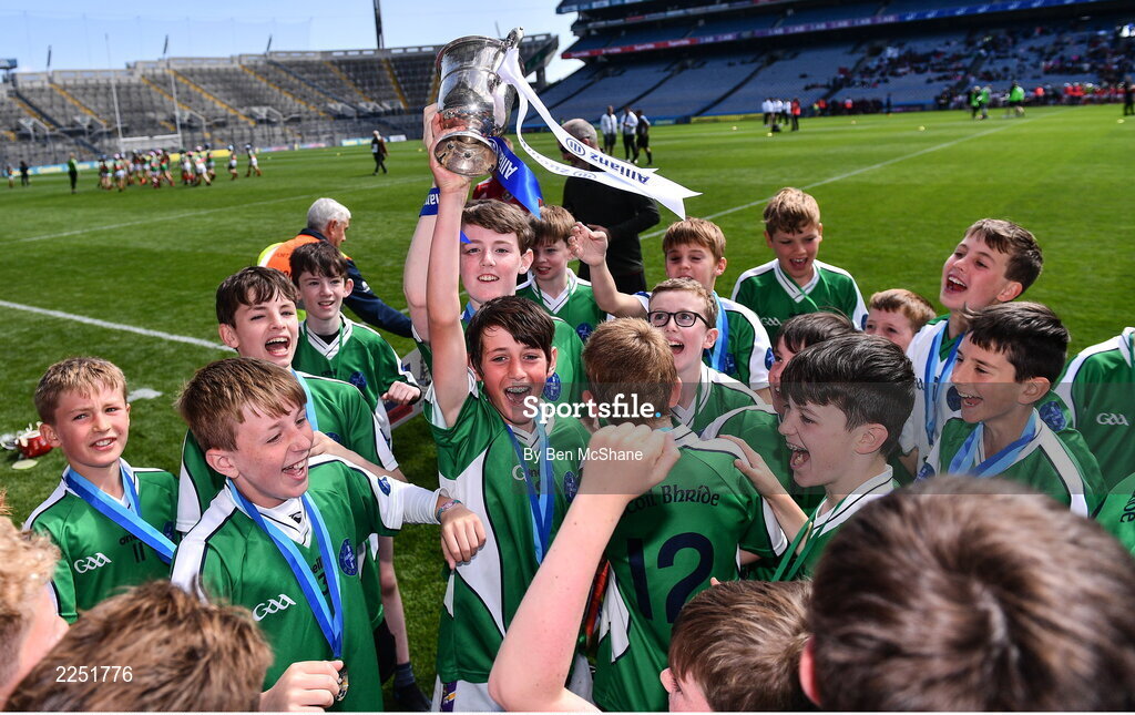 7 June 2022; Scoile Bride Ragnallach, Dublin, players celebrates cup after the Corn JMOB final at the Allianz Cumann na mBunscol Finals in Croke Park, Dublin. Photo by Ben McShane/Sportsfile