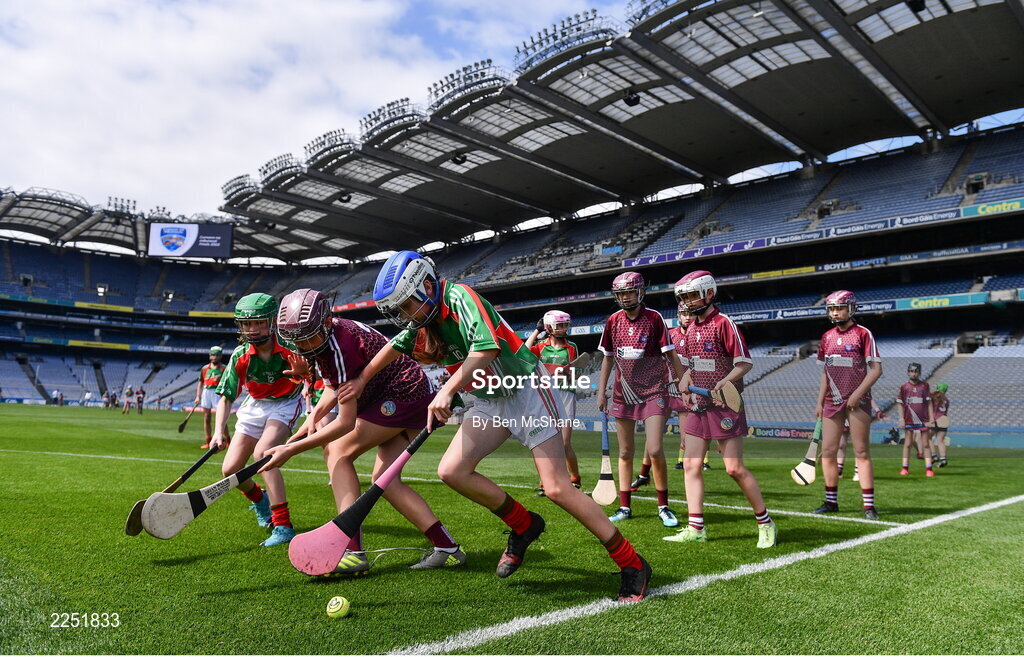 7 June 2022; Sophia Ní Maolruanaidh of Scoil Mologa, Dublin, in action against Anna Satell of Holy Family Swords, Dublin, during the Corn Olly Quinlan final at the Allianz Cumann na mBunscol Finals in Croke Park, Dublin. Photo by Ben McShane/Sportsfile