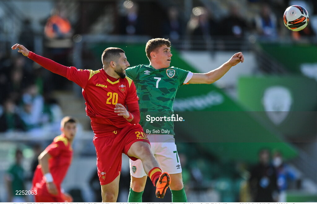 6 June 2022; Gavin Kilkenny of Republic of Ireland in action against Zaim Divanovic of Montenegro during the UEFA European U21 Championship qualifying group F match between Republic of Ireland and Montenegro at Tallaght Stadium in Dublin. Photo by Seb Daly/Sportsfile