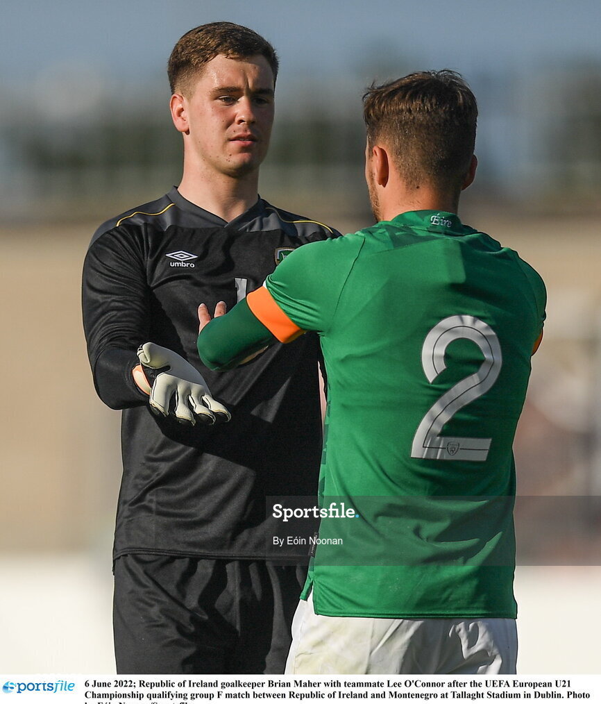 6 June 2022; Republic of Ireland goalkeeper Brian Maher with teammate Lee O'Connor after the UEFA European U21 Championship qualifying group F match between Republic of Ireland and Montenegro at Tallaght Stadium in Dublin. Photo by Eóin Noonan/Sportsfile