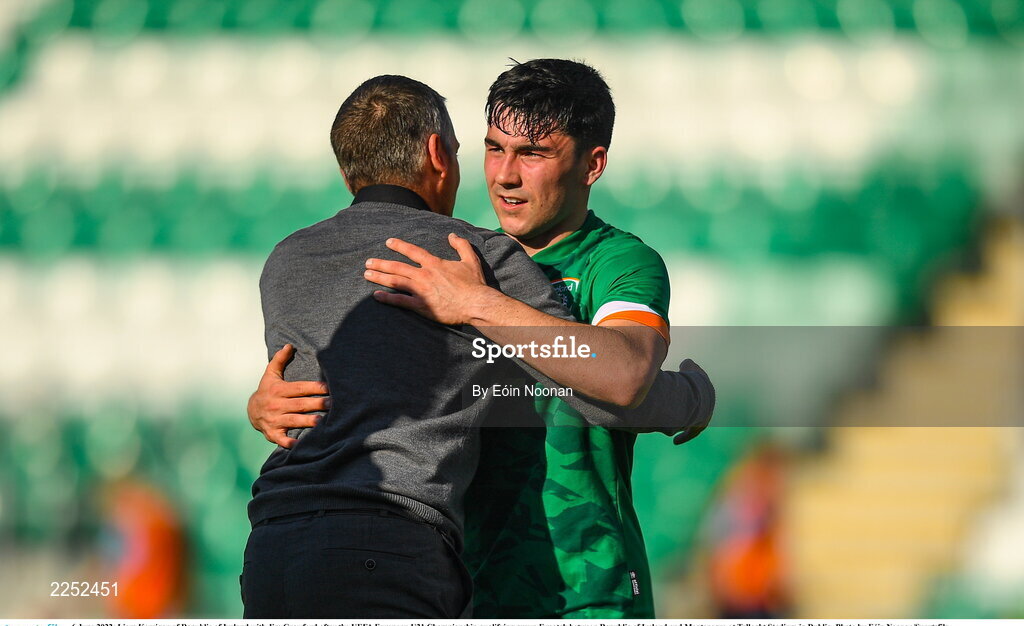 6 June 2022; Liam Kerrigan of Republic of Ireland with Jim Crawford after the UEFA European U21 Championship qualifying group F match between Republic of Ireland and Montenegro at Tallaght Stadium in Dublin. Photo by Eóin Noonan/Sportsfile