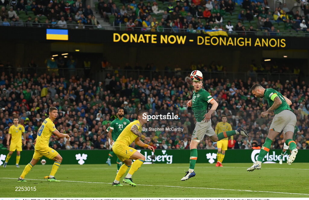 8 June 2022; Shane Duffy of Republic of Ireland heads at goal during the UEFA Nations League B group 1 match between Republic of Ireland and Ukraine at Aviva Stadium in Dublin. Photo by Stephen McCarthy/Sportsfile