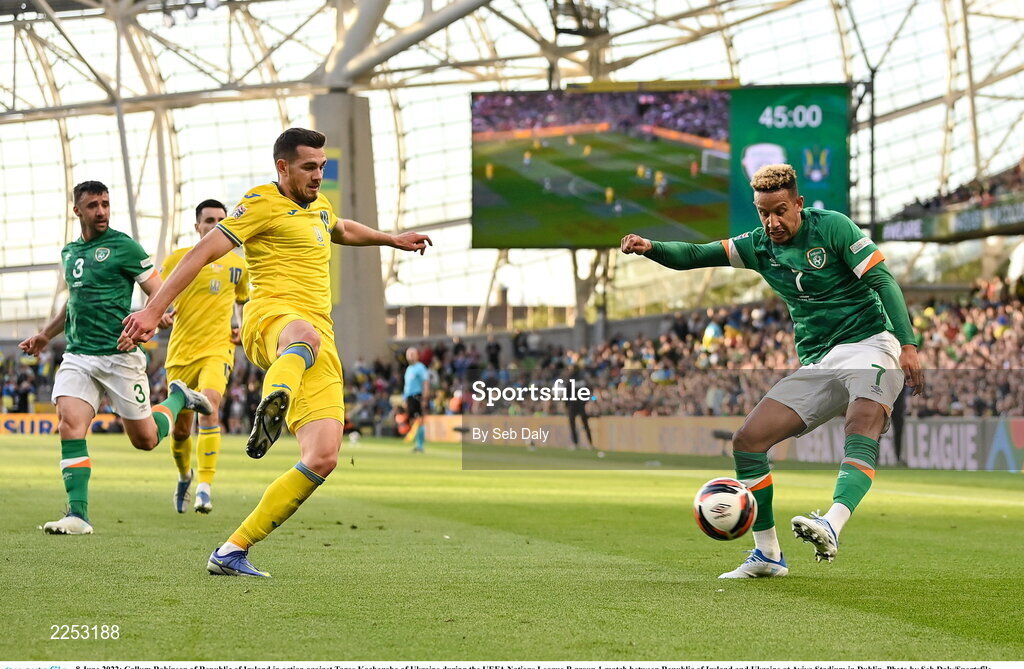 8 June 2022; Callum Robinson of Republic of Ireland in action against Taras Kacharaba of Ukraine during the UEFA Nations League B group 1 match between Republic of Ireland and Ukraine at Aviva Stadium in Dublin. Photo by Seb Daly/Sportsfile