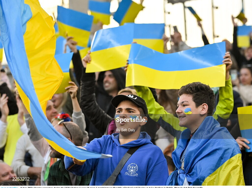 8 June 2022; Ukraine supporters during the UEFA Nations League B group 1 match between Republic of Ireland and Ukraine at Aviva Stadium in Dublin. Photo by Seb Daly/Sportsfile