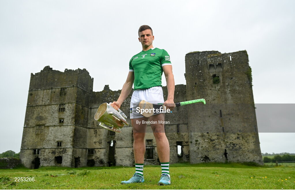 9 June 2022; Mike Casey of Limerick poses for a portrait with the Liam MacCarthy Cup at Loughmore Castle during the GAA Hurling All-Ireland Senior Championship Series national launch in Tipperary. Photo by Brendan Moran/Sportsfile