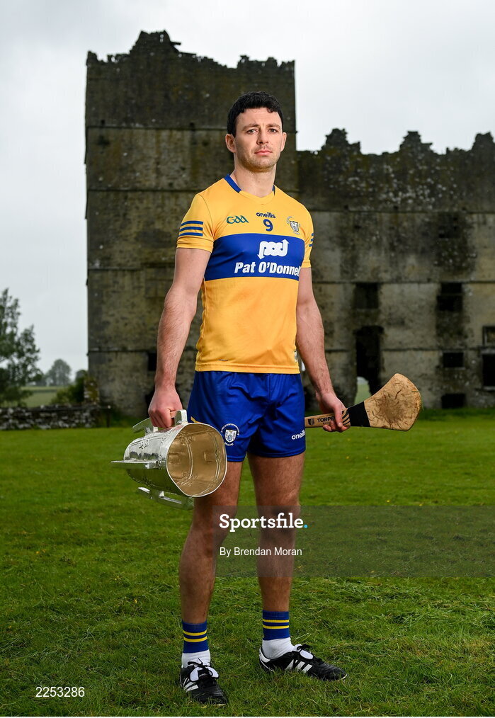 9 June 2022; Cathal Malone of Clare poses for a portrait with the Liam MacCarthy Cup at Loughmore Castle at the GAA Hurling All-Ireland Senior Championship Series national launch in Tipperary. Photo by Brendan Moran/Sportsfile