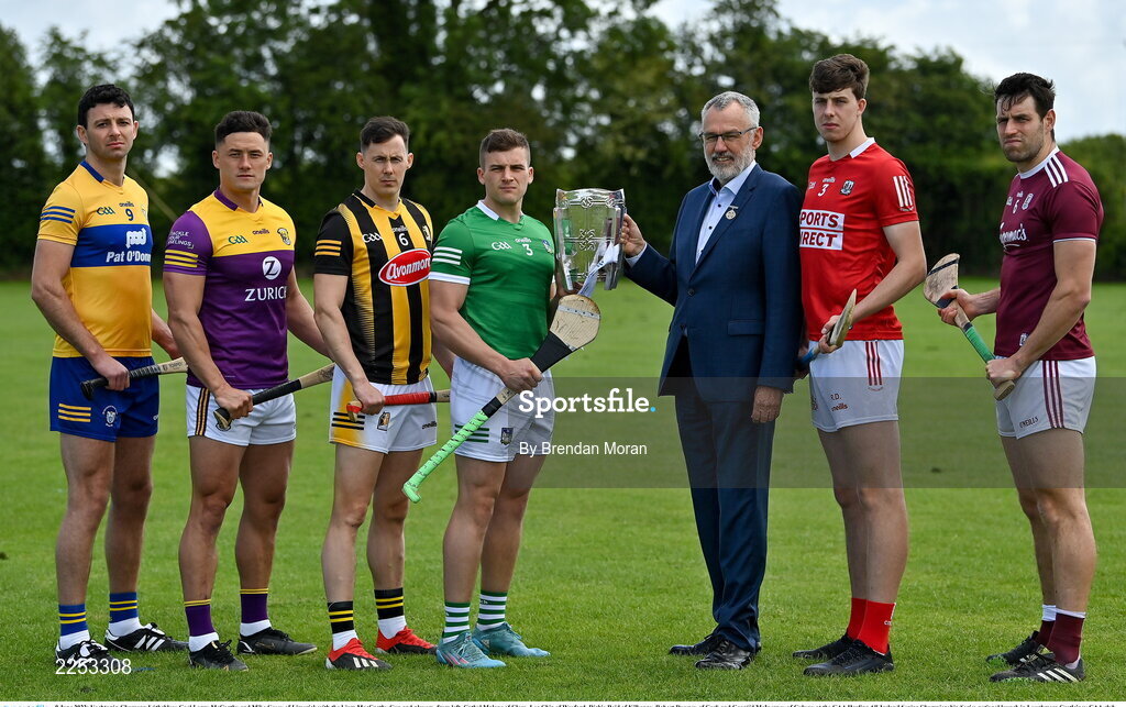 9 June 2022; Uachtarán Chumann Lúthchleas Gael Larry McCarthy and Mike Casey of Limerick with the Liam MacCarthy Cup and players, from left, Cathal Malone of Clare, Lee Chin of Wexford, Richie Reid of Kilkenny, Robert Downey of Cork and Gearóid McInerney of Galway at the GAA Hurling All-Ireland Senior Championship Series national launch in Loughmore Castleiney GAA club, Tipperary. Photo by Brendan Moran/Sportsfile