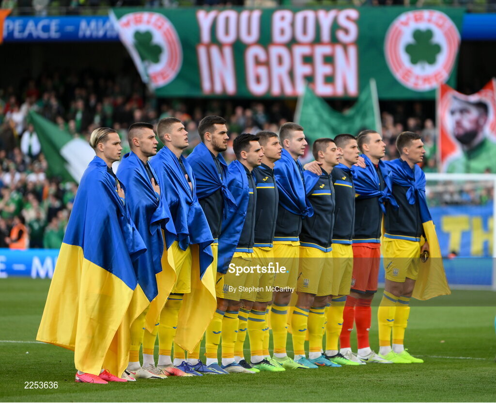 8 June 2022; Ukraine players stand for the playing of the National Anthem before the UEFA Nations League B group 1 match between Republic of Ireland and Ukraine at Aviva Stadium in Dublin. Photo by Stephen McCarthy/Sportsfile