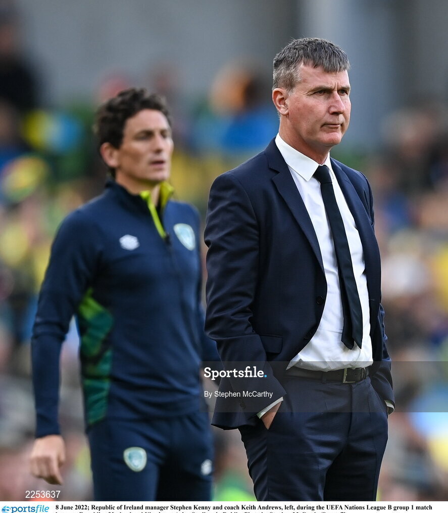 8 June 2022; Republic of Ireland manager Stephen Kenny and coach Keith Andrews, left, during the UEFA Nations League B group 1 match between Republic of Ireland and Ukraine at Aviva Stadium in Dublin. Photo by Stephen McCarthy/Sportsfile
