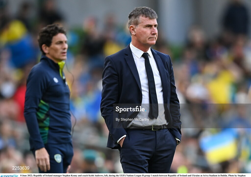 8 June 2022; Republic of Ireland manager Stephen Kenny and coach Keith Andrews, left, during the UEFA Nations League B group 1 match between Republic of Ireland and Ukraine at Aviva Stadium in Dublin. Photo by Stephen McCarthy/Sportsfile