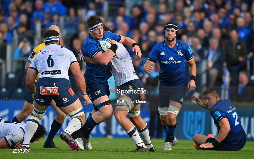 10 June 2022; Joe McCarthy of Leinster is tackled by Ruan Nortje during the United Rugby Championship Semi-Final match between Leinster and Vodacom Bulls at the RDS Arena in Dublin. Photo by Brendan Moran/Sportsfile