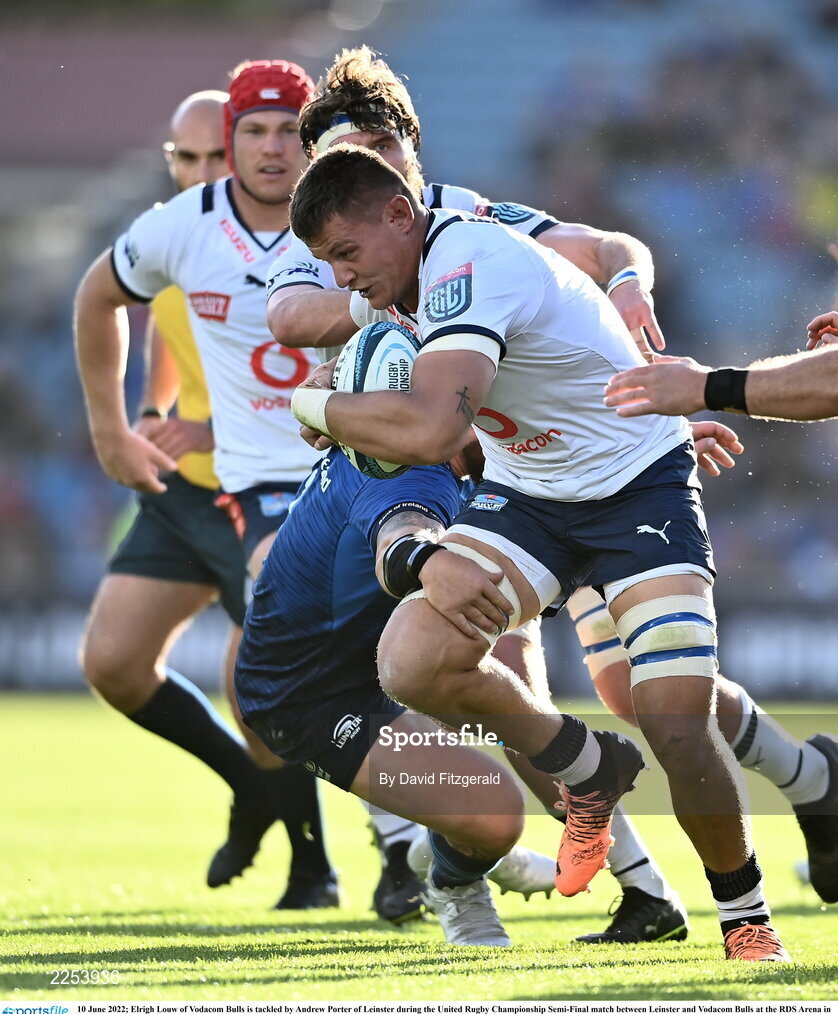 10 June 2022; Elrigh Louw of Vodacom Bulls is tackled by Andrew Porter of Leinster during the United Rugby Championship Semi-Final match between Leinster and Vodacom Bulls at the RDS Arena in Dublin. Photo by David Fitzgerald/Sportsfile