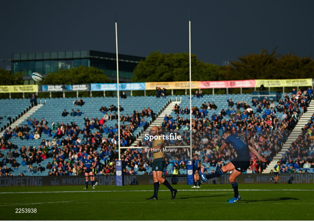 10 June 2022; Ross Byrne of Leinster kicks a conversion during the United Rugby Championship Semi-Final match between Leinster and Vodacom Bulls at the RDS Arena in Dublin. Photo by Harry Murphy/Sportsfile