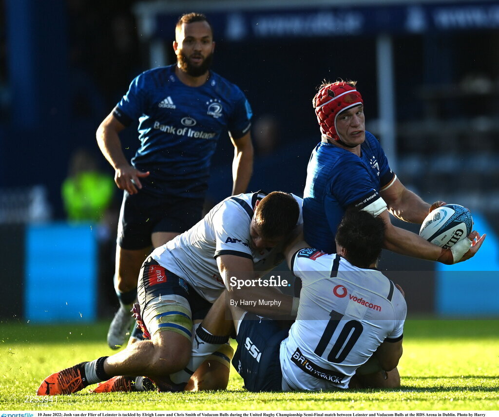 10 June 2022; Josh van der Flier of Leinster is tackled by Elrigh Louw and Chris Smith of Vodacom Bulls during the United Rugby Championship Semi-Final match between Leinster and Vodacom Bulls at the RDS Arena in Dublin. Photo by Harry Murphy/Sportsfile