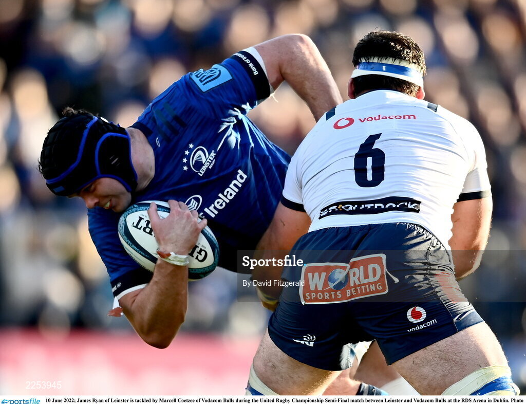 10 June 2022; James Ryan of Leinster is tackled by Marcell Coetzee of Vodacom Bulls during the United Rugby Championship Semi-Final match between Leinster and Vodacom Bulls at the RDS Arena in Dublin. Photo by David Fitzgerald/Sportsfile