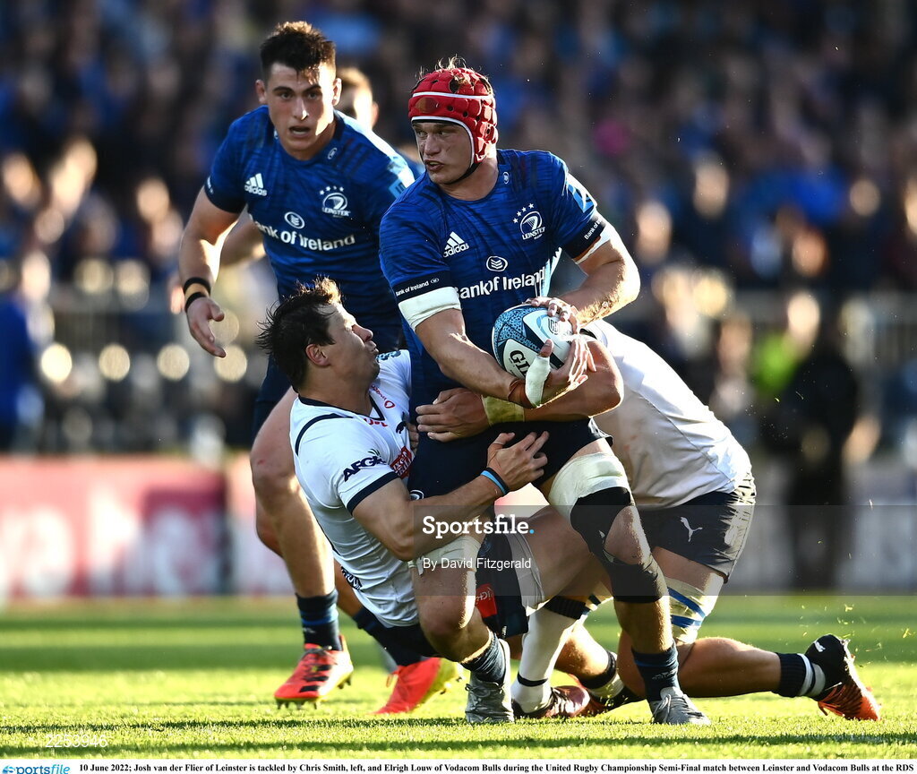 10 June 2022; Josh van der Flier of Leinster is tackled by Chris Smith, left, and Elrigh Louw of Vodacom Bulls during the United Rugby Championship Semi-Final match between Leinster and Vodacom Bulls at the RDS Arena in Dublin. Photo by David Fitzgerald/Sportsfile