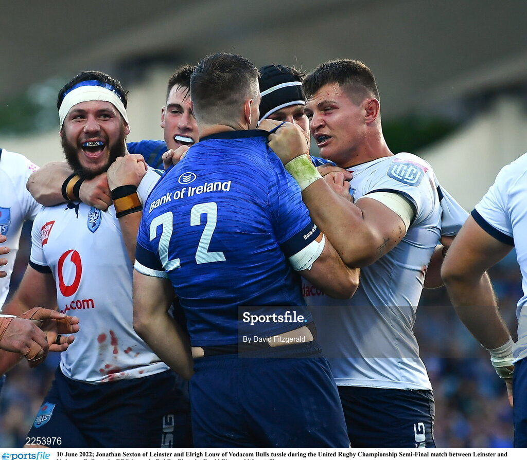 10 June 2022; Jonathan Sexton of Leinster and Elrigh Louw of Vodacom Bulls tussle during the United Rugby Championship Semi-Final match between Leinster and Vodacom Bulls at the RDS Arena in Dublin. Photo by David Fitzgerald/Sportsfile