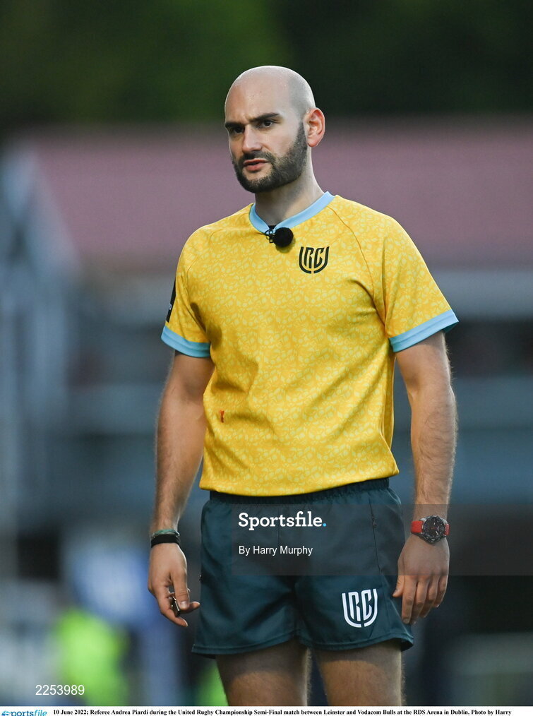 10 June 2022; Referee Andrea Piardi during the United Rugby Championship Semi-Final match between Leinster and Vodacom Bulls at the RDS Arena in Dublin. Photo by Harry Murphy/Sportsfile