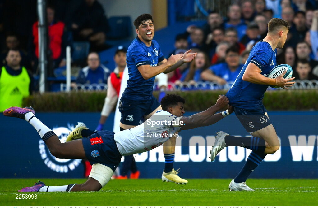 10 June 2022; Garry Ringrose of Leinster is tackled by Canan Moodie of Vodacom Bulls during the United Rugby Championship Semi-Final match between Leinster and Vodacom Bulls at the RDS Arena in Dublin. Photo by Harry Murphy/Sportsfile