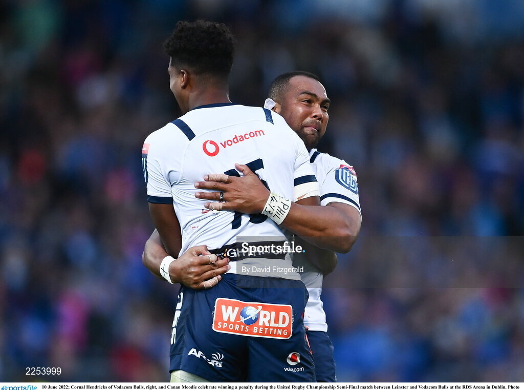 10 June 2022; Cornal Hendricks of Vodacom Bulls, right, and Canan Moodie celebrate winning a penalty during the United Rugby Championship Semi-Final match between Leinster and Vodacom Bulls at the RDS Arena in Dublin. Photo by David Fitzgerald/Sportsfile