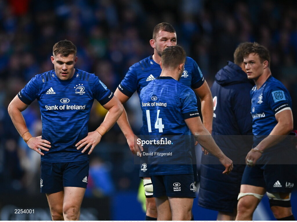 10 June 2022; Leinster players, from left, Garry Ringrose, Ross Molony, Jordan Larmour and Josh van der Flier after the United Rugby Championship Semi-Final match between Leinster and Vodacom Bulls at the RDS Arena in Dublin. Photo by David Fitzgerald/Sportsfile