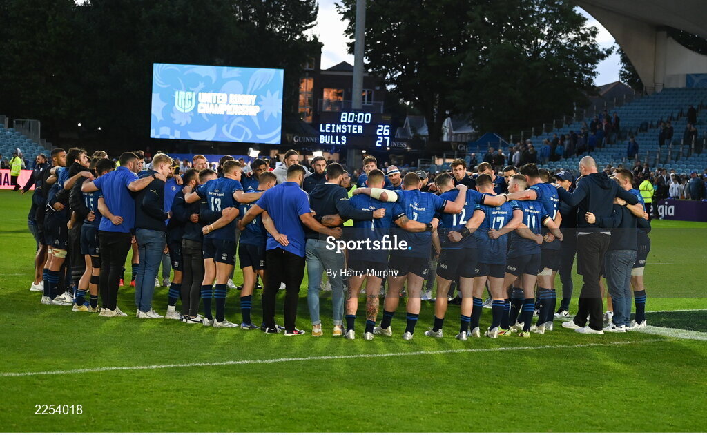 10 June 2022; Leinster players huddle after their side's defeat in the United Rugby Championship Semi-Final match between Leinster and Vodacom Bulls at the RDS Arena in Dublin. Photo by Harry Murphy/Sportsfile