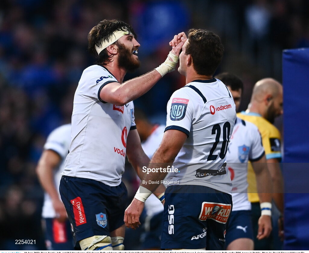 10 June 2022; Ruan Nortje, left, and WJ Steenkamp of Vodacom Bulls celebrate after the United Rugby Championship Semi-Final match between Leinster and Vodacom Bulls at the RDS Arena in Dublin. Photo by David Fitzgerald/Sportsfile
