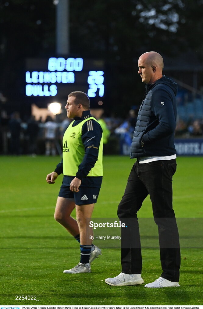 10 June 2022; Retiring Leinster players Devin Toner and Seán Cronin after their side's defeat in the United Rugby Championship Semi-Final match between Leinster and Vodacom Bulls at the RDS Arena in Dublin. Photo by Harry Murphy/Sportsfile