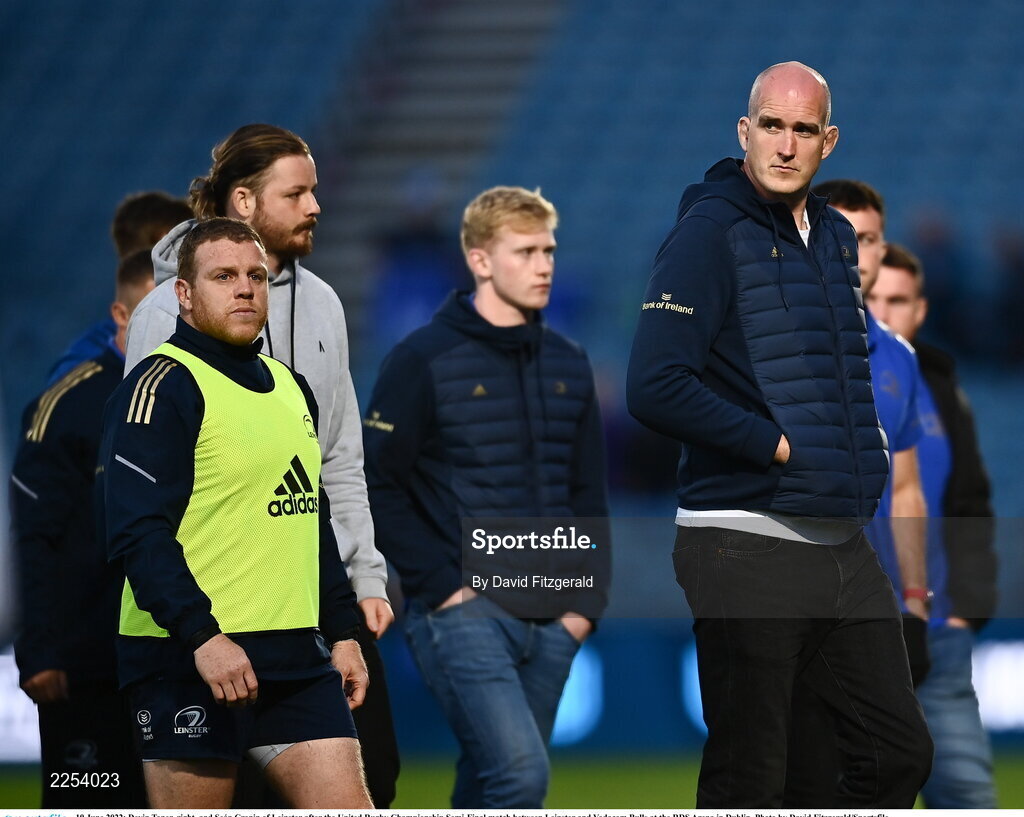 10 June 2022; Devin Toner, right, and Seán Cronin of Leinster after the United Rugby Championship Semi-Final match between Leinster and Vodacom Bulls at the RDS Arena in Dublin. Photo by David Fitzgerald/Sportsfile