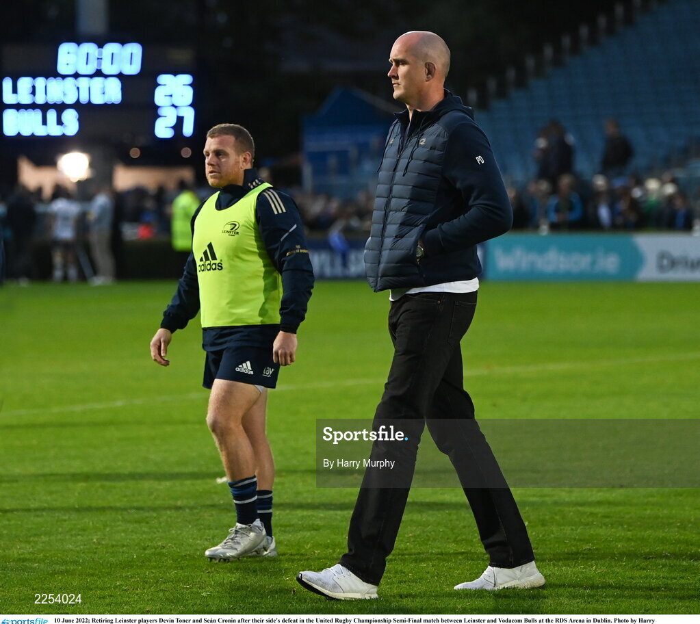 10 June 2022; Retiring Leinster players Devin Toner and Seán Cronin after their side's defeat in the United Rugby Championship Semi-Final match between Leinster and Vodacom Bulls at the RDS Arena in Dublin. Photo by Harry Murphy/Sportsfile