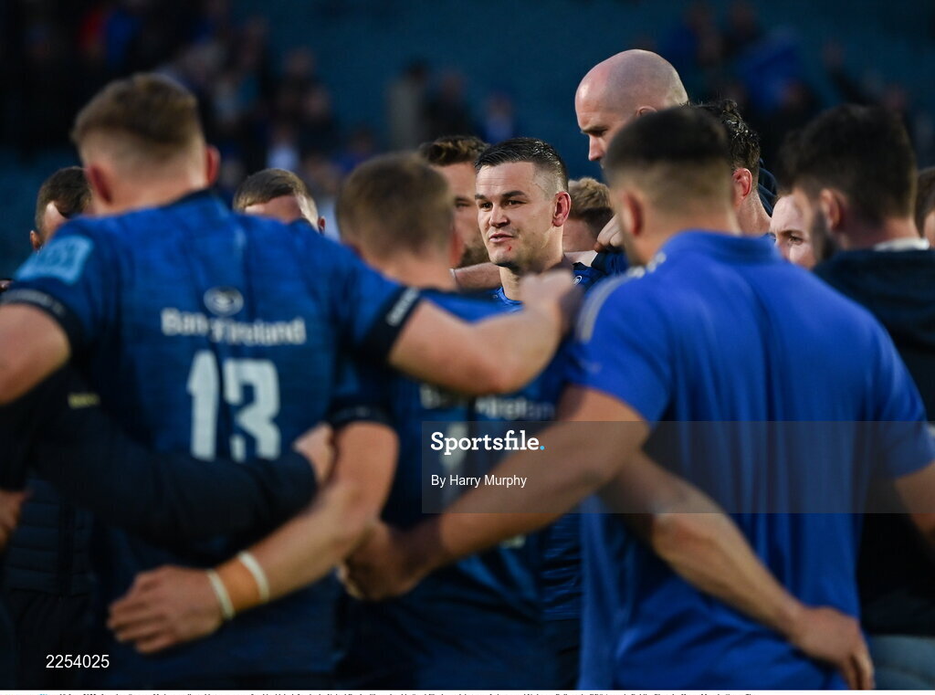 10 June 2022; Jonathan Sexton of Leinster talks to his teammates after his side's defeat in the United Rugby Championship Semi-Final match between Leinster and Vodacom Bulls at the RDS Arena in Dublin. Photo by Harry Murphy/Sportsfile