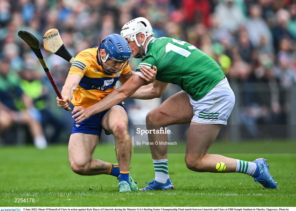 5 June 2022; Shane O'Donnell of Clare in action against Kyle Hayes of Limerick during the Munster GAA Hurling Senior Championship Final match between Limerick and Clare at FBD Semple Stadium in Thurles, Tipperary. Photo by Piaras Ó Mídheach/Sportsfile