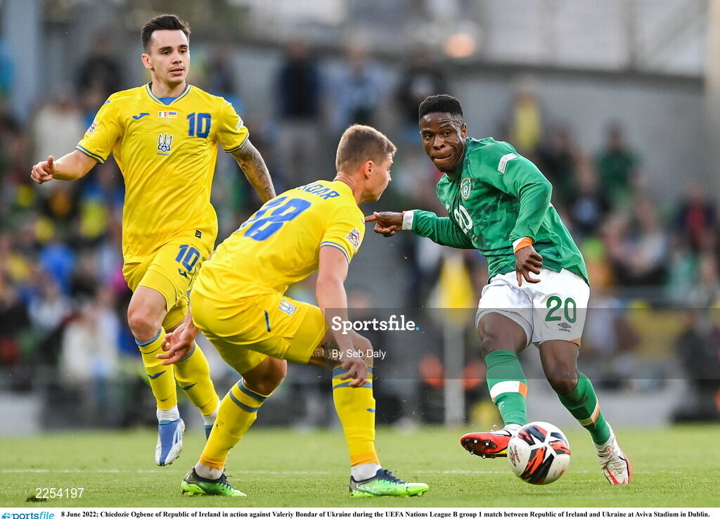 8 June 2022; Chiedozie Ogbene of Republic of Ireland in action against Valeriy Bondar of Ukraine during the UEFA Nations League B group 1 match between Republic of Ireland and Ukraine at Aviva Stadium in Dublin. Photo by Seb Daly/Sportsfile