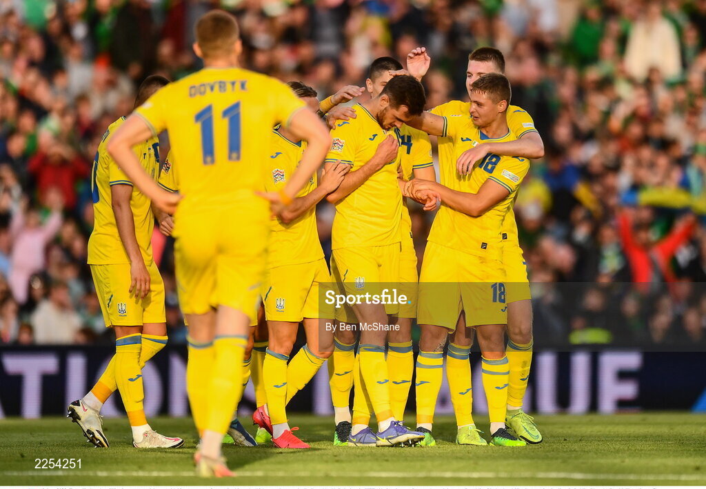 8 June 2022; Taras Kacharaba of Ukraine, centre, celebrates with his teammates after scoring his goal, which was subsequently disallowed by VAR during the UEFA Nations League B group 1 match between Republic of Ireland and Ukraine at Aviva Stadium in Dublin. Photo by Ben McShane/Sportsfile