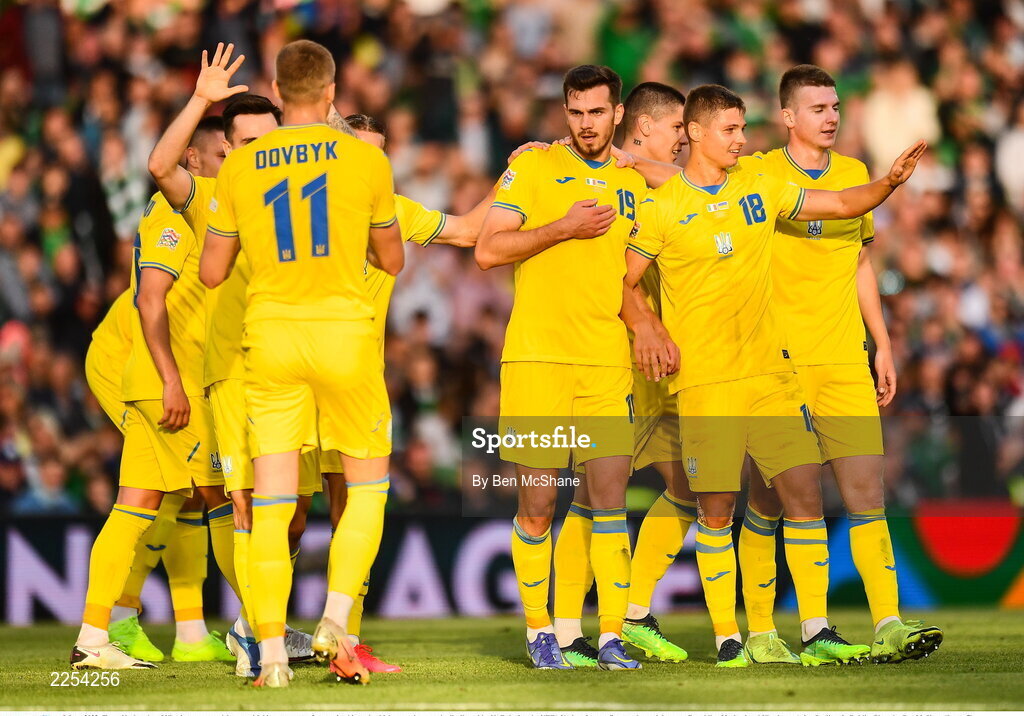 8 June 2022; Taras Kacharaba of Ukraine, centre, celebrates with his teammates after scoring his goal, which was subsequently disallowed by VAR during the UEFA Nations League B group 1 match between Republic of Ireland and Ukraine at Aviva Stadium in Dublin. Photo by Ben McShane/Sportsfile