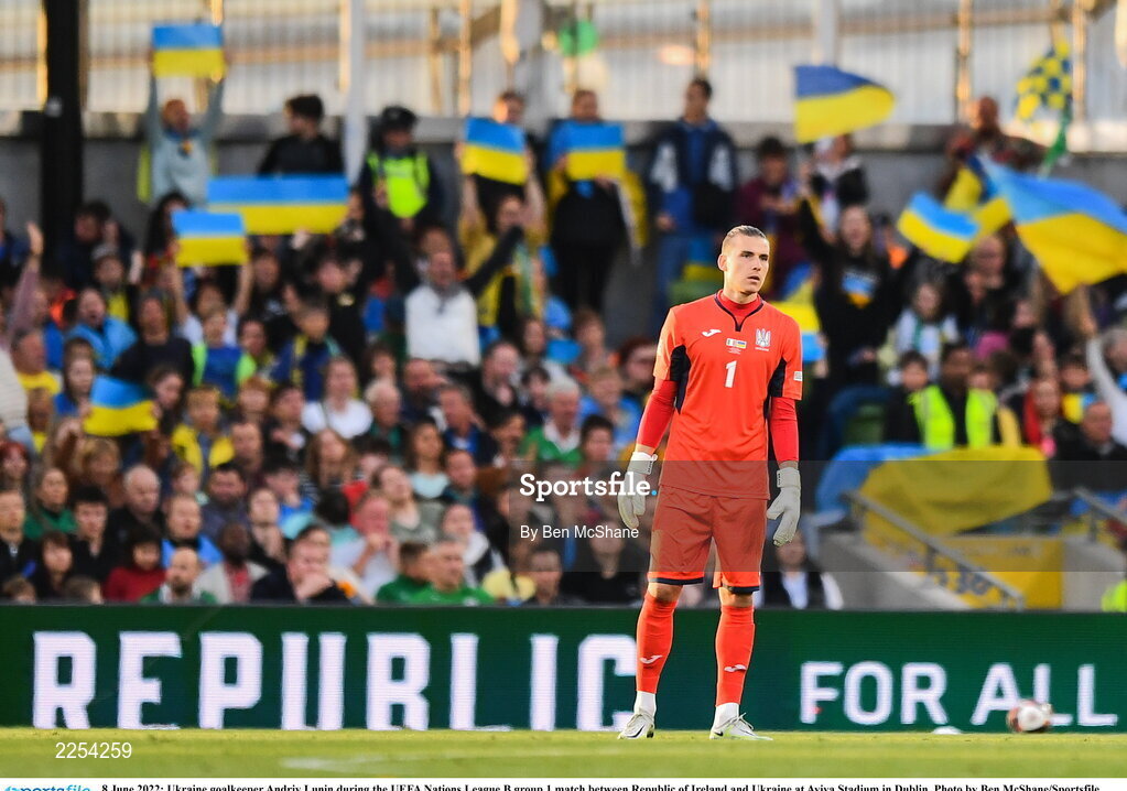 8 June 2022; Ukraine goalkeeper Andriy Lunin during the UEFA Nations League B group 1 match between Republic of Ireland and Ukraine at Aviva Stadium in Dublin. Photo by Ben McShane/Sportsfile
