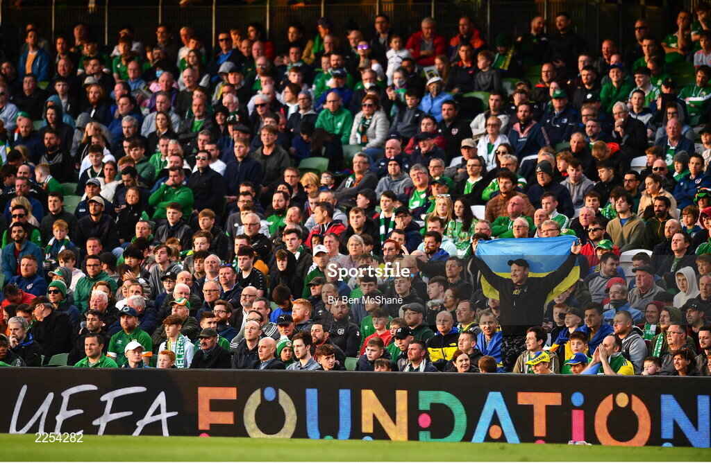 8 June 2022; A Ukraine supporter holds up the flag during the UEFA Nations League B group 1 match between Republic of Ireland and Ukraine at Aviva Stadium in Dublin. Photo by Ben McShane/Sportsfile