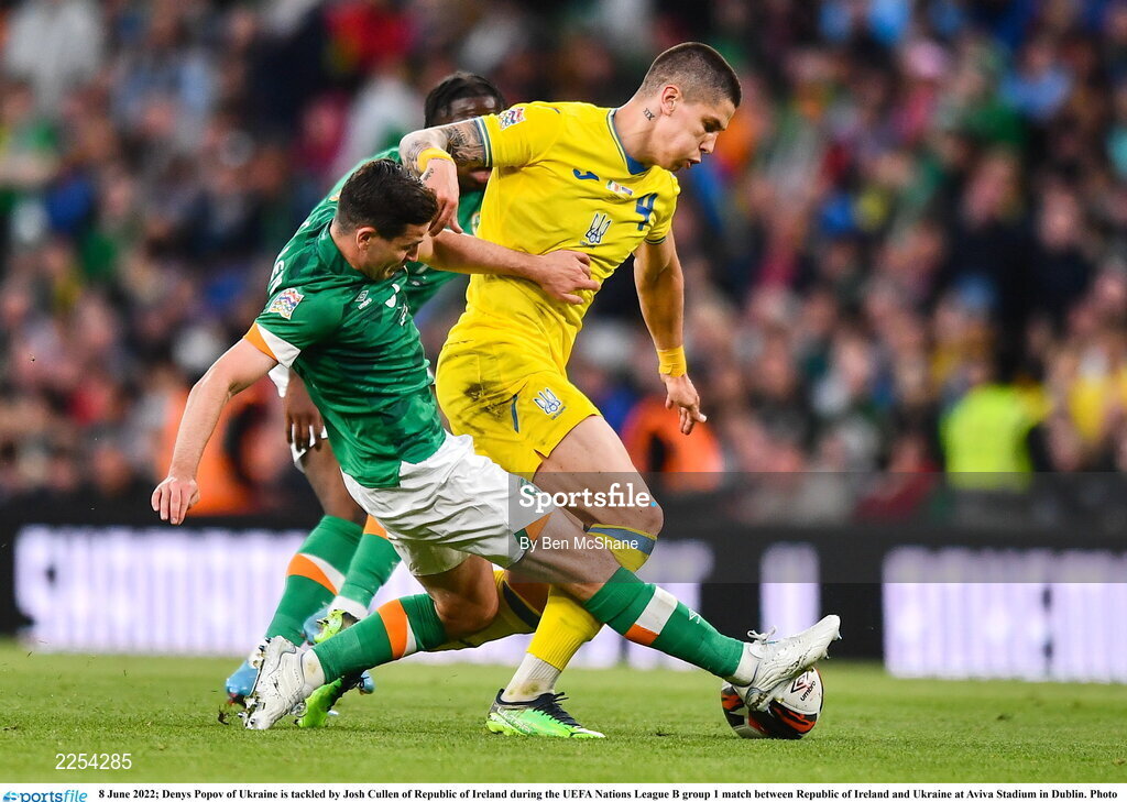 8 June 2022; Denys Popov of Ukraine is tackled by Josh Cullen of Republic of Ireland during the UEFA Nations League B group 1 match between Republic of Ireland and Ukraine at Aviva Stadium in Dublin. Photo by Ben McShane/Sportsfile