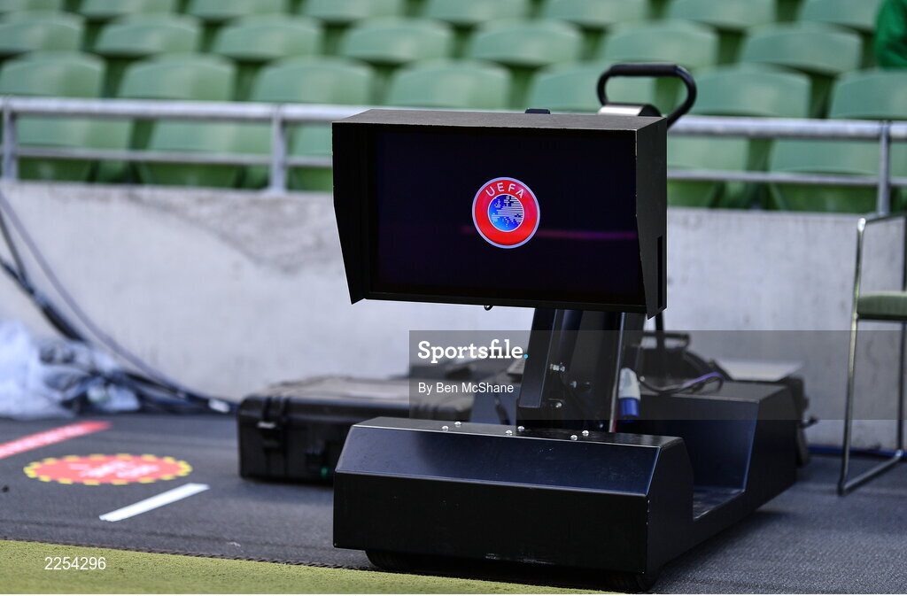 8 June 2022; The VAR screen is seen before the UEFA Nations League B group 1 match between Republic of Ireland and Ukraine at Aviva Stadium in Dublin. Photo by Ben McShane/Sportsfile