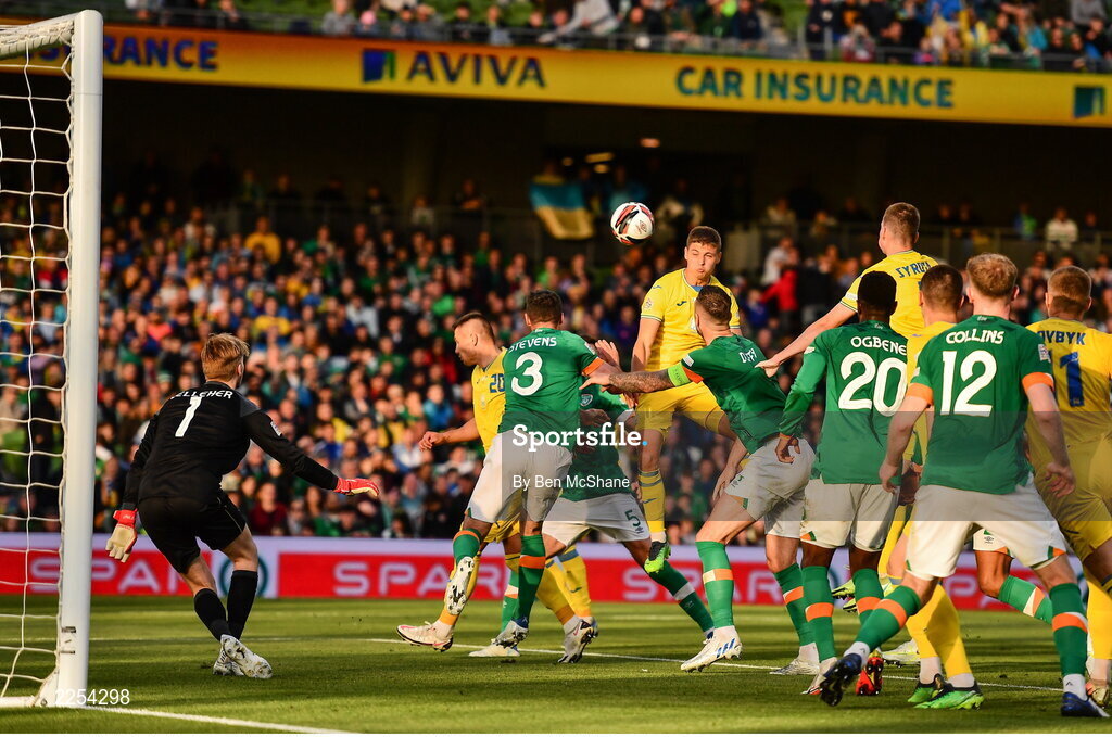 8 June 2022; Valeriy Bondar of Ukraine has a header on goal during the UEFA Nations League B group 1 match between Republic of Ireland and Ukraine at Aviva Stadium in Dublin. Photo by Ben McShane/Sportsfile
