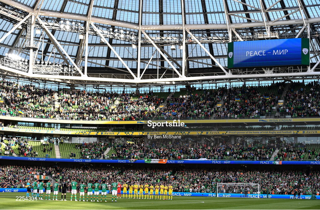 8 June 2022; Players of both side's stand for a minutes applause before the UEFA Nations League B group 1 match between Republic of Ireland and Ukraine at Aviva Stadium in Dublin. Photo by Ben McShane/Sportsfile