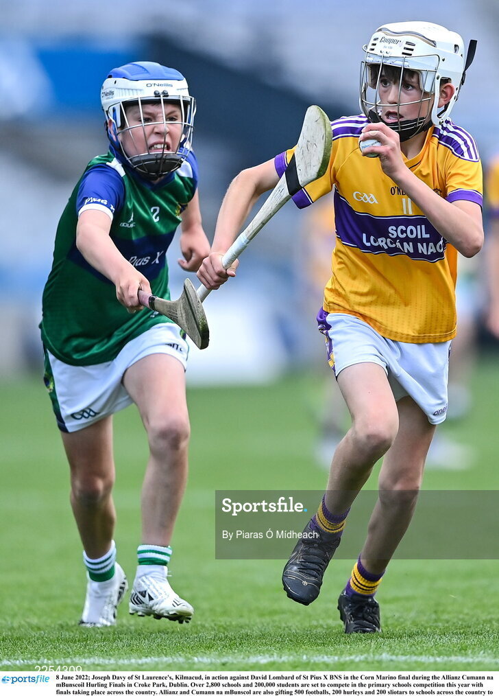 8 June 2022; Joseph Davy of St Laurence's, Kilmacud, in action against David Lombard of St Pius X BNS in the Corn Marino final during the Allianz Cumann na mBunscoil Hurling Finals in Croke Park, Dublin. Over 2,800 schools and 200,000 students are set to compete in the primary schools competition this year with finals taking place across the country. Allianz and Cumann na mBunscol are also gifting 500 footballs, 200 hurleys and 200 sliotars to schools across the country to welcome Ukrainian students into our national games and local communities. Photo by Piaras Ó Mídheach/Sportsfile
