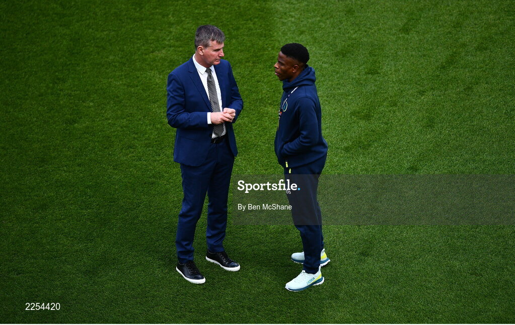 11 June 2022; Republic of Ireland manager Stephen Kenny speaks to Chiedozie Ogbene before the UEFA Nations League B group 1 match between Republic of Ireland and Scotland at the Aviva Stadium in Dublin. Photo by Stephen McCarthy/Sportsfile Photo by Ben McShane/Sportsfile
