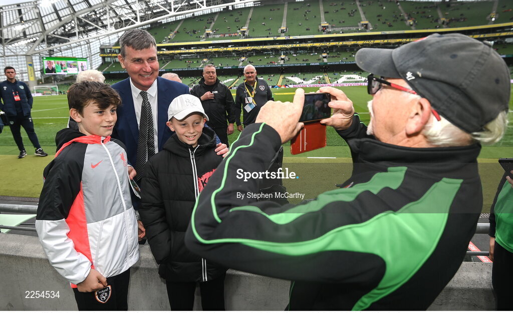 11 June 2022; Republic of Ireland manager Stephen Kenny poses for a selfie with supporters before the UEFA Nations League B group 1 match between Republic of Ireland and Scotland at the Aviva Stadium in Dublin. Photo by Stephen McCarthy/Sportsfile
