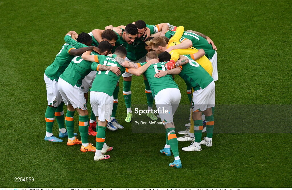11 June 2022; The Republic of Ireland team huddle before the UEFA Nations League B group 1 match between Republic of Ireland and Scotland at the Aviva Stadium in Dublin. Photo by Ben McShane/Sportsfile