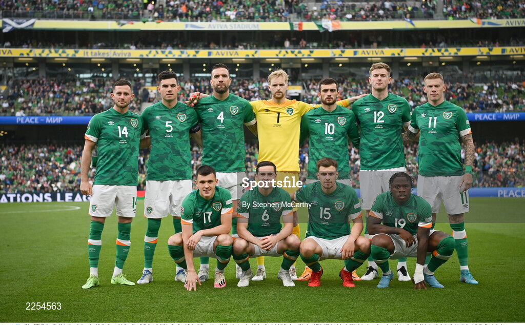 11 June 2022; The Republic of Ireland team, back row, from left, Alan Browne, John Egan, Shane Duffy, Caoimhin Kelleher, Troy Parrott, Nathan Collins, and James McClean. Front row, from left, Jason Knight, Josh Cullen, Jayson Molumby and Michael Obafemi before the UEFA Nations League B group 1 match between Republic of Ireland and Scotland at the Aviva Stadium in Dublin. Photo by Stephen McCarthy/Sportsfile