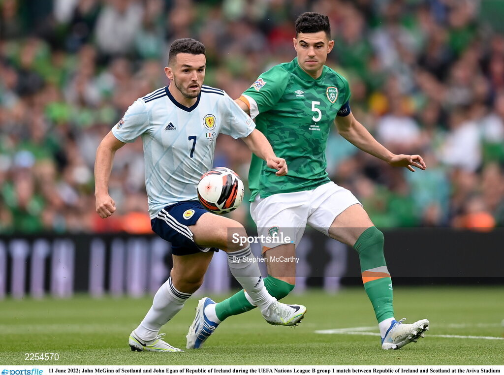 11 June 2022; John McGinn of Scotland and John Egan of Republic of Ireland during the UEFA Nations League B group 1 match between Republic of Ireland and Scotland at the Aviva Stadium in Dublin. Photo by Stephen McCarthy/Sportsfile