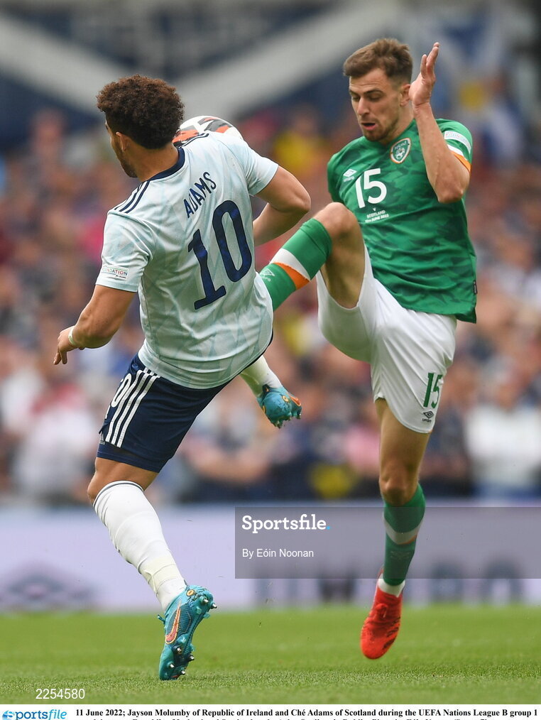 11 June 2022; Jayson Molumby of Republic of Ireland and Ché Adams of Scotland during the UEFA Nations League B group 1 match between Republic of Ireland and Scotland at the Aviva Stadium in Dublin. Photo by Eóin Noonan/Sportsfile
