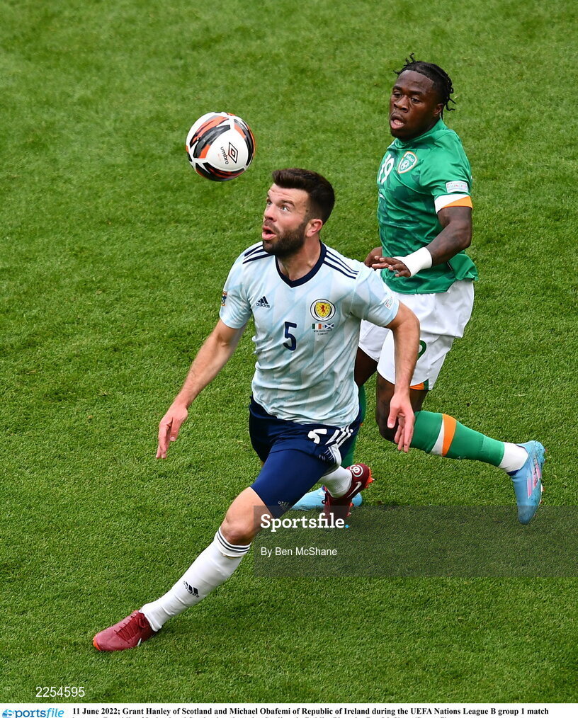 11 June 2022; Grant Hanley of Scotland and Michael Obafemi of Republic of Ireland during the UEFA Nations League B group 1 match between Republic of Ireland and Scotland at the Aviva Stadium in Dublin. Photo by Ben McShane/Sportsfile
