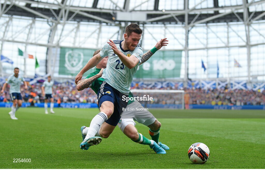 11 June 2022; Anthony Ralston of Scotland is tackled by James McClean of Republic of Ireland during the UEFA Nations League B group 1 match between Republic of Ireland and Scotland at the Aviva Stadium in Dublin. Photo by Eóin Noonan/Sportsfile